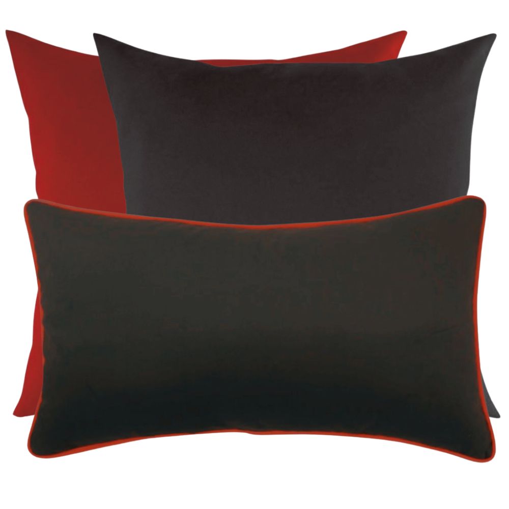 Poduszka wykonana jest z tkaniny tapicerskiej w kolorze czarnym z czerwoną lamówką. Jest przyjemna w dotyku. Idealna do salonu lub sypialni doda pomieszczeniu przytulności i elegancji