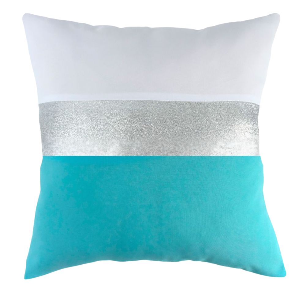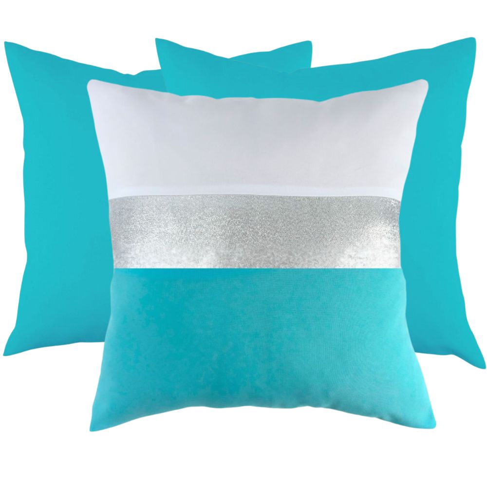 Zestaw poduszek dekoracyjnych: jedna poduszka ze srebrnym paskiem, dwie turkusowe